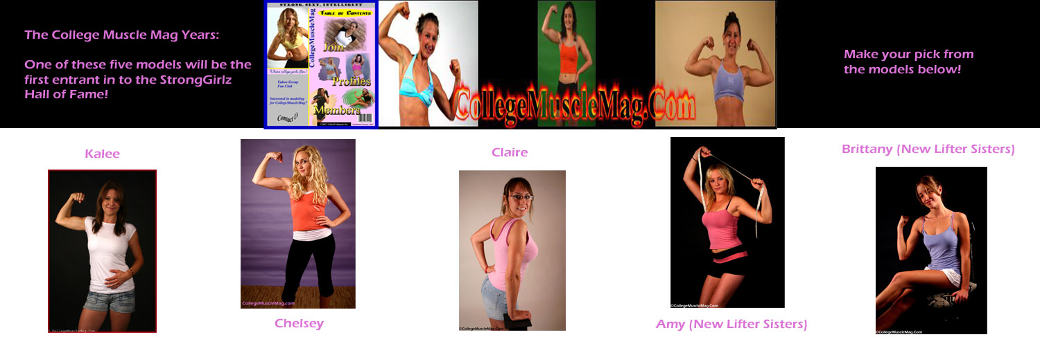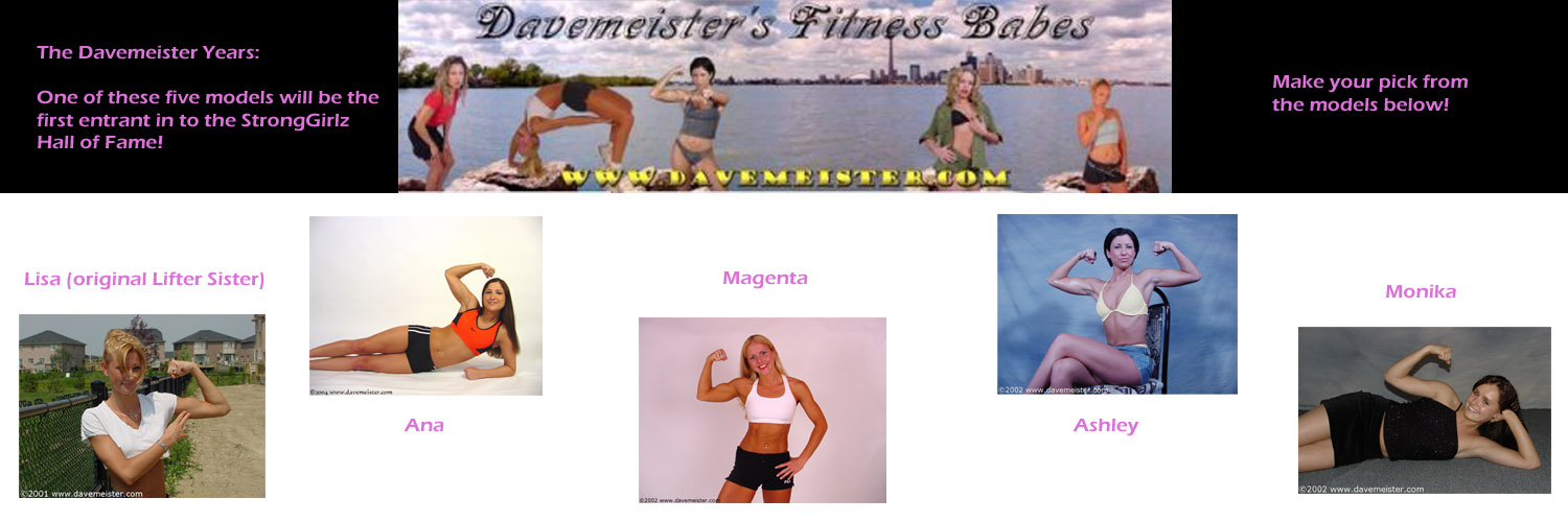 StrongGirlz Hall of Fame...you choose the first class! Davemeister's Fitness Babes began as a simple fan site on "Geocities" (look it up, kids!) back in December, 1996. Our affiliation with Builtmore Productions gave us the opportunity to begin our own member's site in mid-1997. From there, our content and style evolved, as Davemeister's Fitness Babes grew in to one of the most popular lift and carry sites on the web. It led to the creation of several off-shoot sites including Carousa's Flex Appeal and Liftlovers, while also influencing the creation of Liftn' and Carrying. In 2007, 10 years after the debut of Davemeister's, we launched a new era of female muscle, with College Muscle Mag, focusing exclusively on college and university athletes. In 2013, the current StrongGirlz.com was launched, introducing the world to a new generation of beautiful, intelligent, and strong athletic women. Several of our models even launched their own sites as a result of working with us, including Jessie Gem, JenCFitness, and KimLifts. Now, after 20 years of producing content, we're getting nostalgic and want to pay tribute to some of our all-time greatest models. But while we're selecting a group of models that merit consideration for the first class of the StrongGirlz Hall of Fame, we want YOU to choose the winners! The candidates are grouped in to the periods in which they modeled for us: The Davemeister Years, The College Muscle Mag Years, and the StrongGirlz Years. From each group of 5, select 1 model that you would like to see enter our "first-round" Hall of Fame. CAST YOUR VOTES AT THE BOTTOM OF THE PAGE!